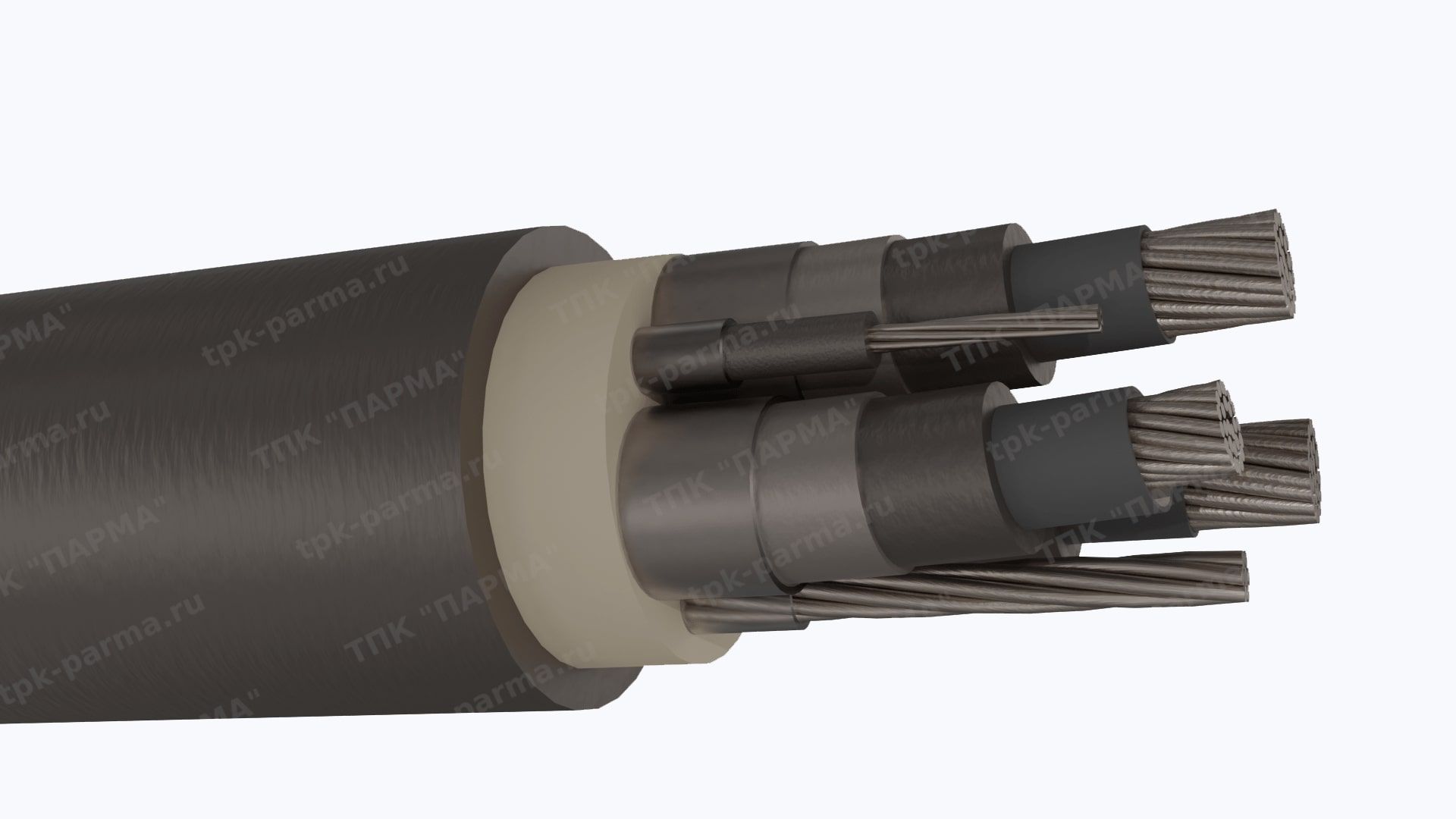 1. Три многопроволочные медные лужёные круглые основные жилы с площадью номинального поперечного сечения 95 мм2, соответствующие 5 классу по ГОСТ 22483-2012.